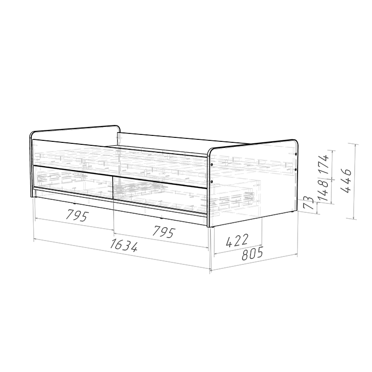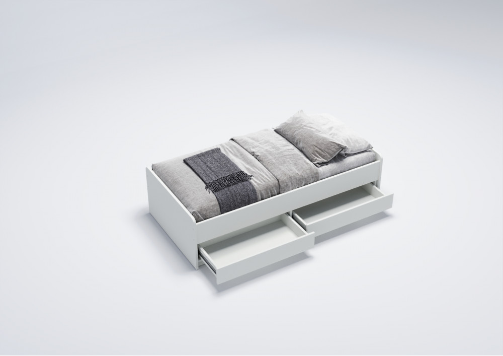 3. Практичные ящики: Кровать оснащена двумя выдвижными вместительными ящиками, которые оборудованы телескопическими направляющими с фиксаторами для легкого открытия и закрытия. Это предоставляет дополнительное место для хранения игрушек, одежды или постельного белья, что особенно удобно в ограниченном пространстве.